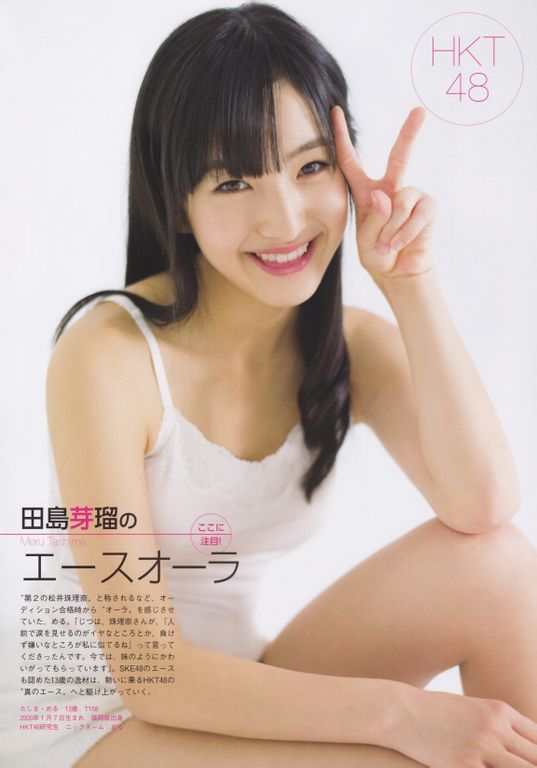 Tashima Meru's Ace AuraDescribed as the "new Matsui Jurina", since she passed the auditions Meru has been making people feel her "aura". "Actually Jurina-san told me 'You're like me because you don't like crying in front of others and because you're a sore loser'. Now she treats me affectionately, like a younger sister." This 13-year-old talent, acknowledged even by the SKE48 ace, will keep on climbing to the "true ace" status in the energetic HKT48. (*credited to DreamingPebbles